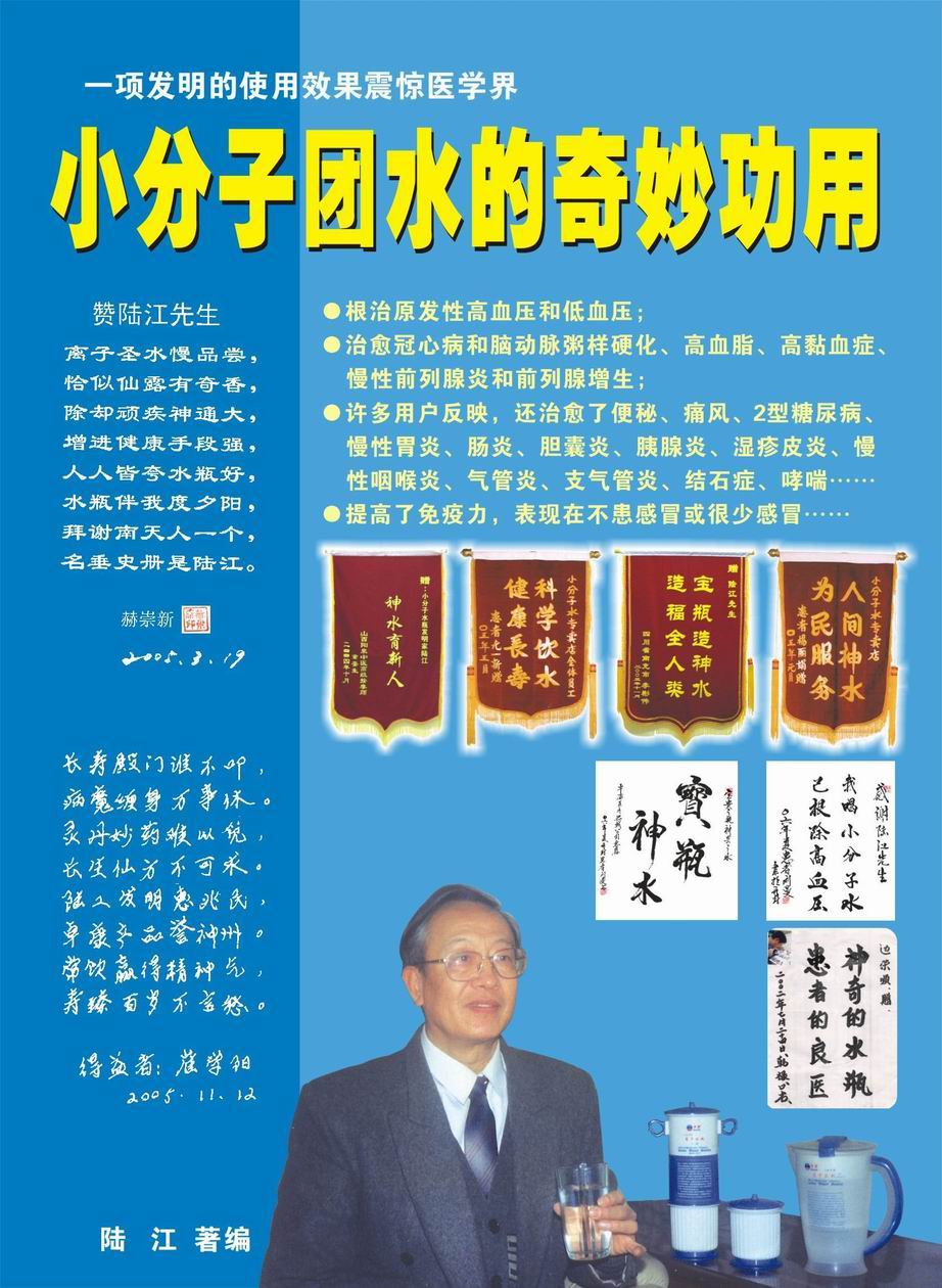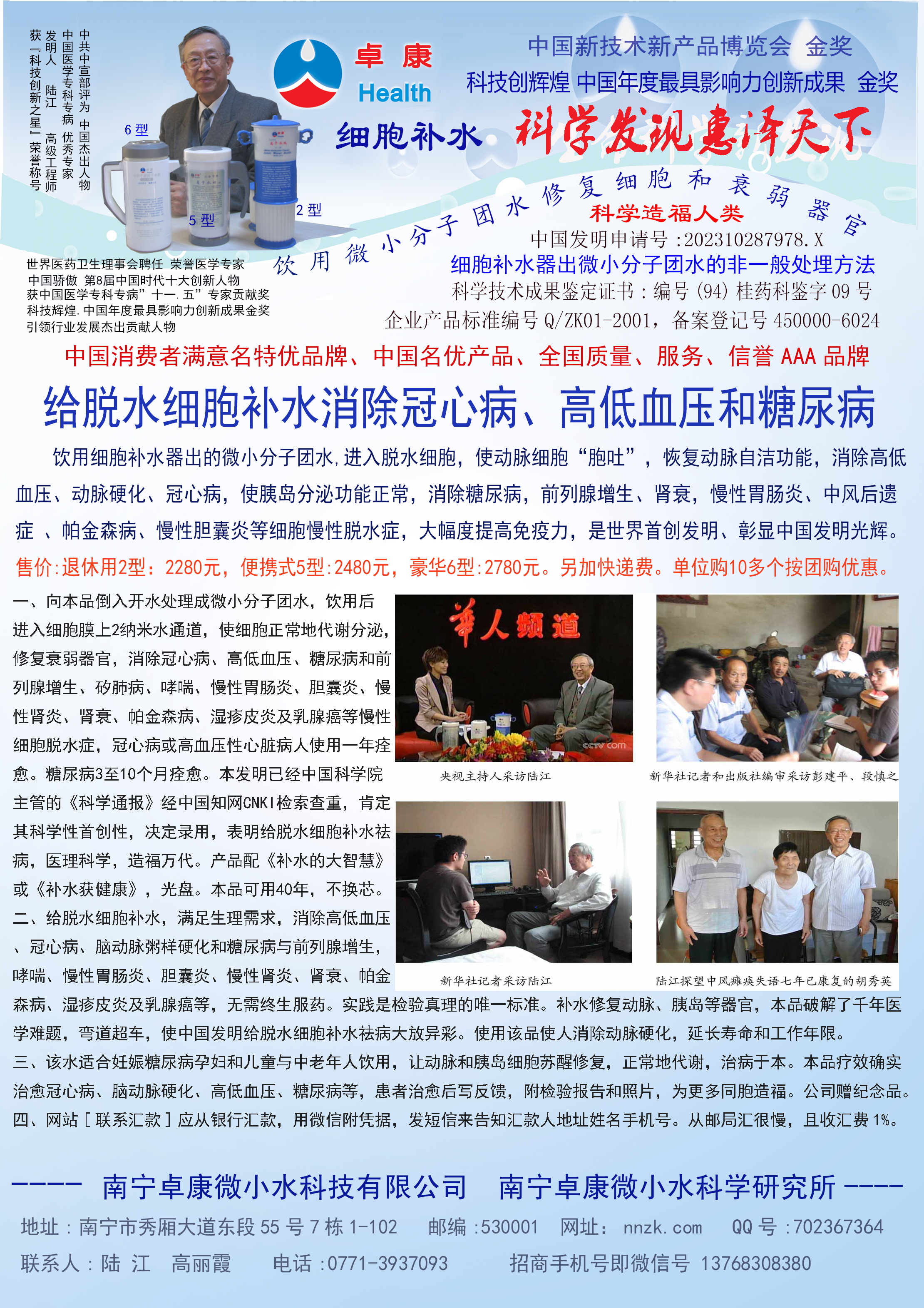 人類幾千年來患以上病癥需終生服藥,幾十年也不能治愈。可是我國南寧的高級工程師陸 江,于1990年想根治高血壓,研究發(fā)明了離子水瓶,處理出微小分子團水供飲用,經(jīng)過醫(yī)院臨床試用和專家鑒定,1999年獲中國發(fā)明專利權,產(chǎn)品于2000年投放市場后一直跟蹤調(diào)查,據(jù)全國各地用戶反饋:祛除了高低血壓、糖尿病和冠心病,并使前列腺增生、咽喉炎、鼻竇炎、慢性氣管炎、支氣管炎、矽肺病、哮喘、慢性胃炎、腸炎、慢性膽囊炎、慢性腎炎、腎衰、膀胱炎、便秘、痔瘡、風濕性關節(jié)炎和濕疹皮炎及中風后遺癥等病癥不藥而愈。為什么喝微小水能治20多種病?陸 江從1991年德國科學家發(fā)現(xiàn)細胞膜水通道僅為2納米獲得啟發(fā),認為多種器官患病是因細胞脫水,不能正常代謝和分裂增殖,才使器官細胞減少致衰弱萎縮而形成細胞缺水性病癥。22年來的實踐有力地支持了“細胞脫水致病”這一重要論點,表明喝微小水可滿足細胞的生理需求,補水就能祛病,是生命科學新亮點。