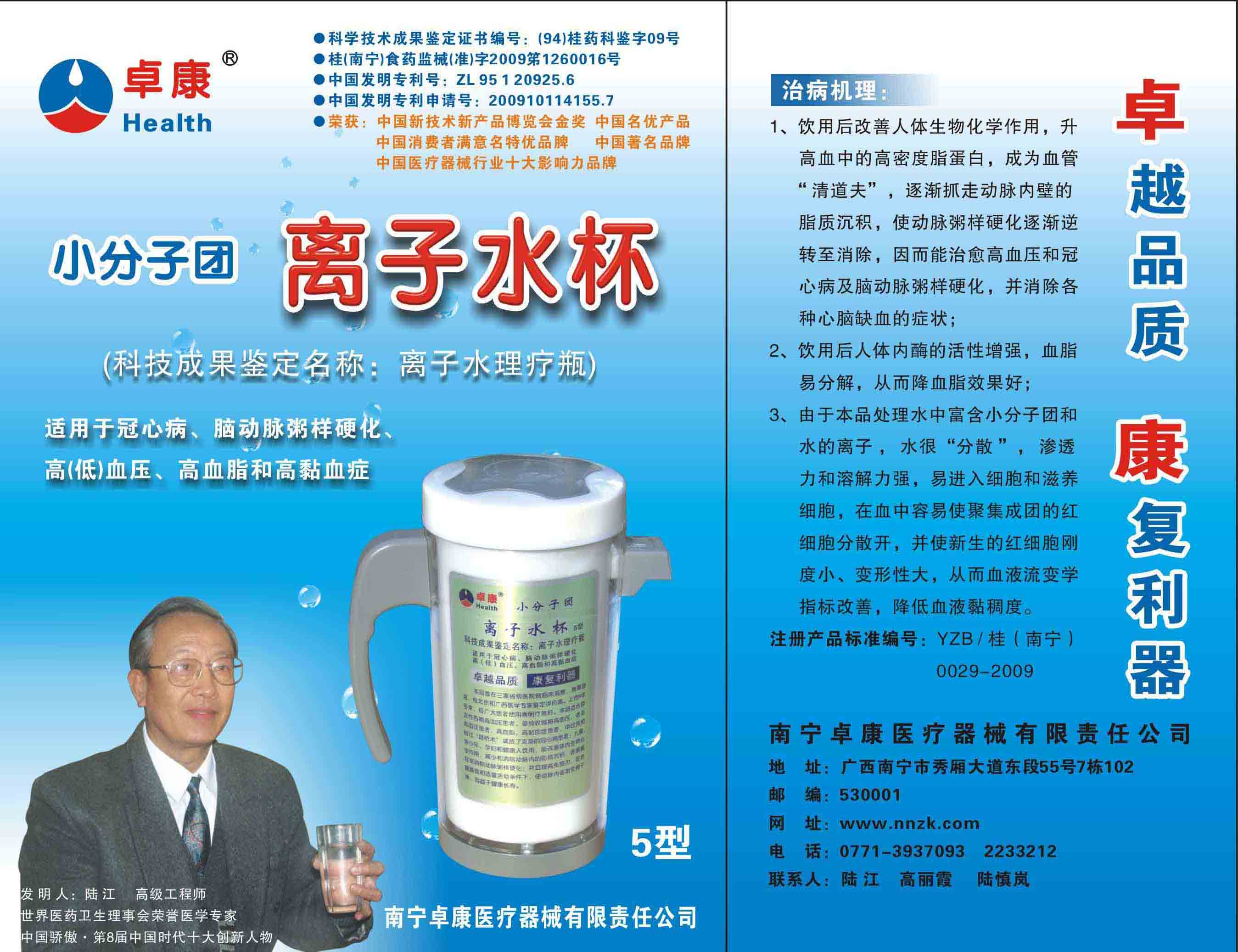 - -----南寧卓康微小水科技有限公司原為南寧卓康醫(yī)療器械有限責任公司 ,用戶普遍反饋高血壓患者飲用2—5個月,癥狀消除,不再服藥,治愈了高血壓; 冠心病患者,包括已做和未做支架或搭撟手術者,經(jīng)3—5個月飲用,消除心痛、胸悶、早搏、房顫和心絞痛等癥狀,逆轉至消除動脈粥樣硬化和斑塊,一年左右治愈冠心病,心腦電圖正常,經(jīng)冠脈造影掃描無明顯狹窄,表明冠心病痊愈;糖尿病人飲用3-10個月,血糖尿糖正常,治愈2型糖尿病; 并且使前列腺增生、低血壓、腦萎慢性咽喉炎、慢性氣管炎、支氣管炎、哮喘、矽肺病、甲亢、慢性胃腸炎、膽囊炎、慢性腎炎、腎衰、風濕性關節(jié)炎、痔瘡和濕疹皮炎及中風癱瘓或偏癱失語后遺癥等不藥而愈,且多病同治,無需終生服藥,彌補了幾千年來藥物的欠缺,使“微小水”成為人類消除高血壓、冠心病和糖尿病的寶貴資源。腦動脈粥樣硬化、低血壓和前列腺增生患者,一般飲用四個月痊愈;中風后遺癥患者,一般飲用8個月痊愈。請詳閱《用戶反饋》欄目中大量患者的反饋信、檢測報告,有的還附照片。產(chǎn)品屢獲大獎,論文也屢獲一等獎。廣大用戶好評不斷,有口皆碑。